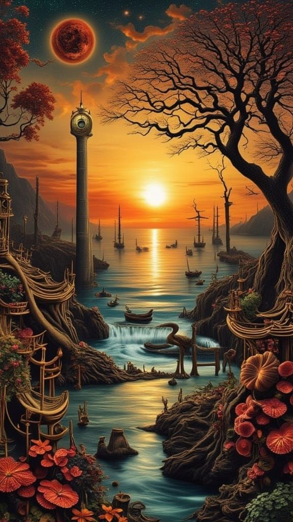 A lone heron graces a surreal paper zen garden with waterfalls and bonsai, under ethereal light. A divine hand grasps the sun above burning waves.