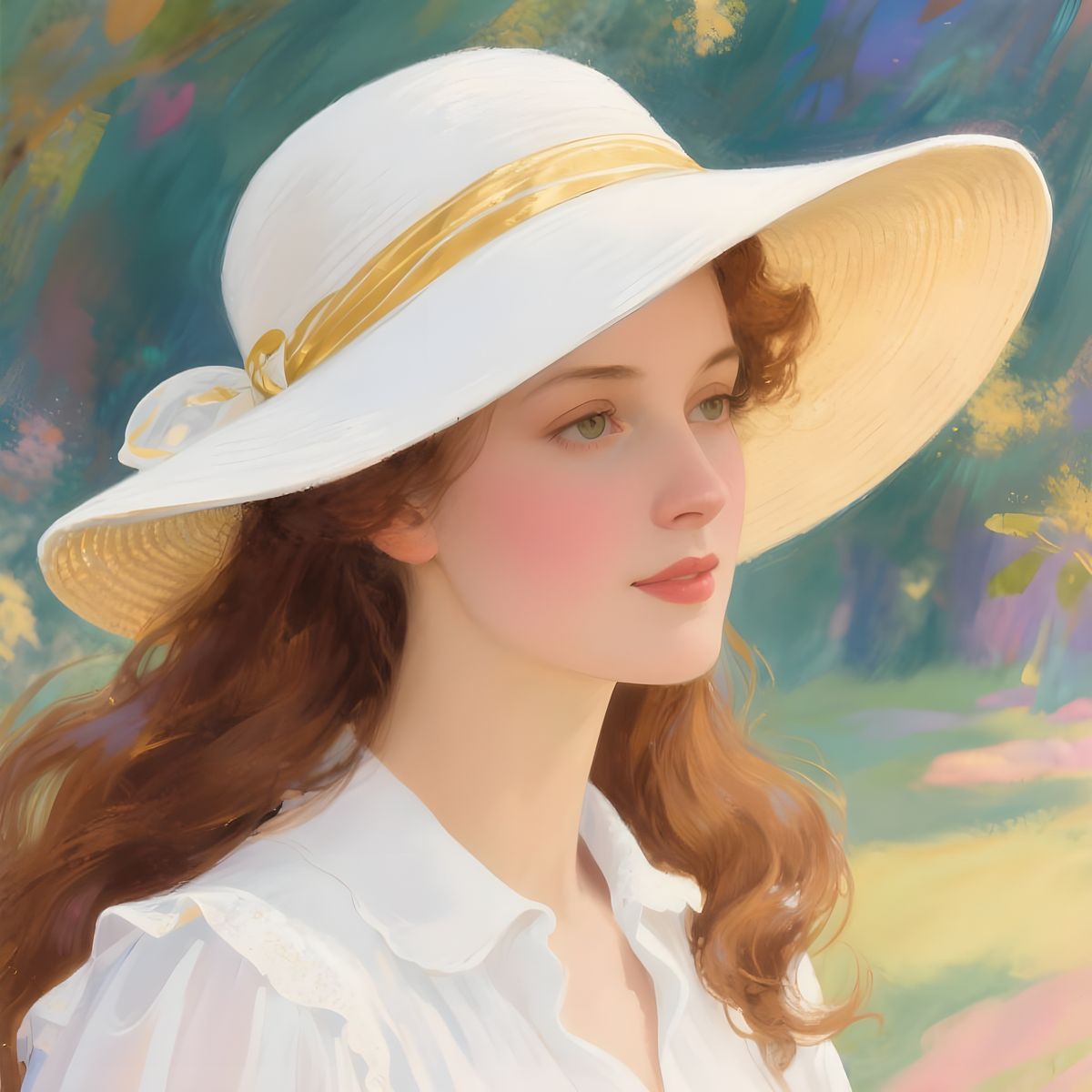 This image features a stunningly realistic portrait of a woman with long brown hair, wearing an elegant white sun hat with a golden stripe and a matching blouse. The art style is highly detailed and colorful.