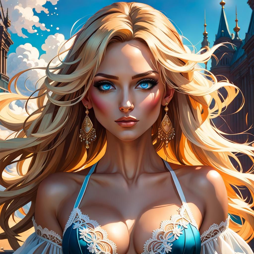 A digital aquarelle of a beautiful woman with long blonde hair and blue eyes, wearing a white lace bra, with clouds in the background. Rendered with dynamic lighting and intricate detail.