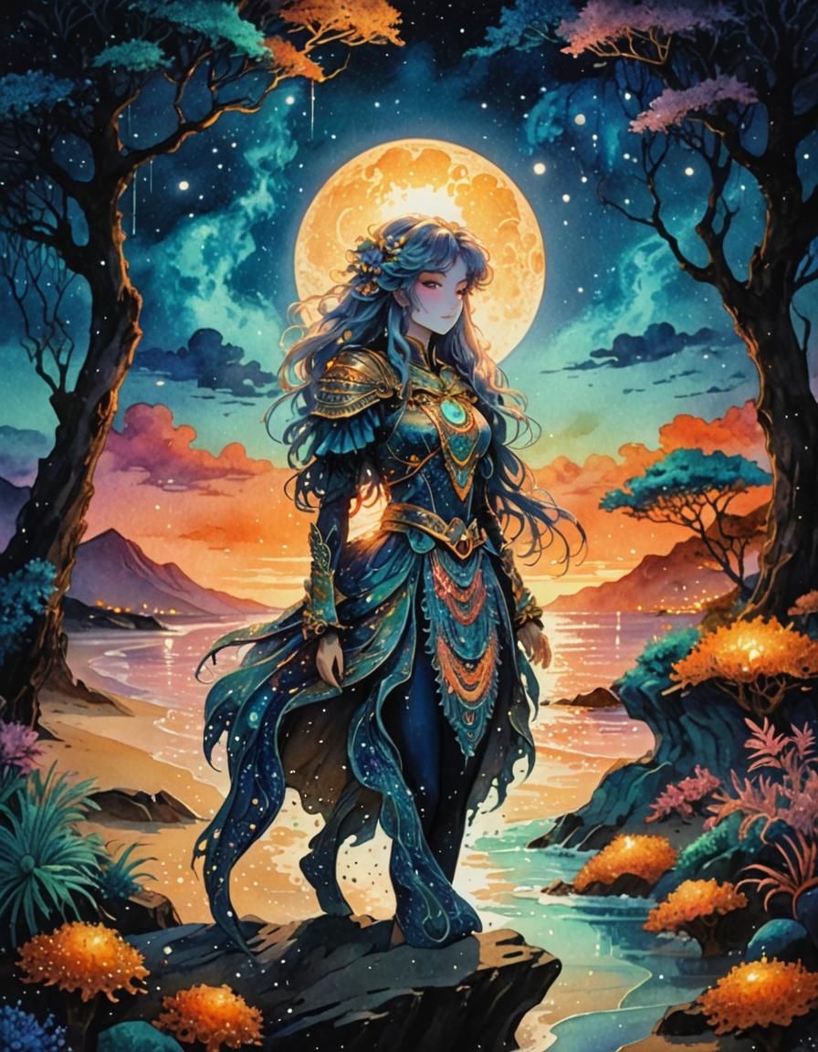 hyper detailed epic 80s anime watercolor art of a ghostly beauty made of sand close to the water on a magical beach in the moonlight, yuji shinkawa Michael Kaluta Yoshitaka Amano Aleksandr Kuskov Josephine Wall hyper detailed gold Pointillism art magical artwork, playful, kitschy, dreamy, enchanting ...