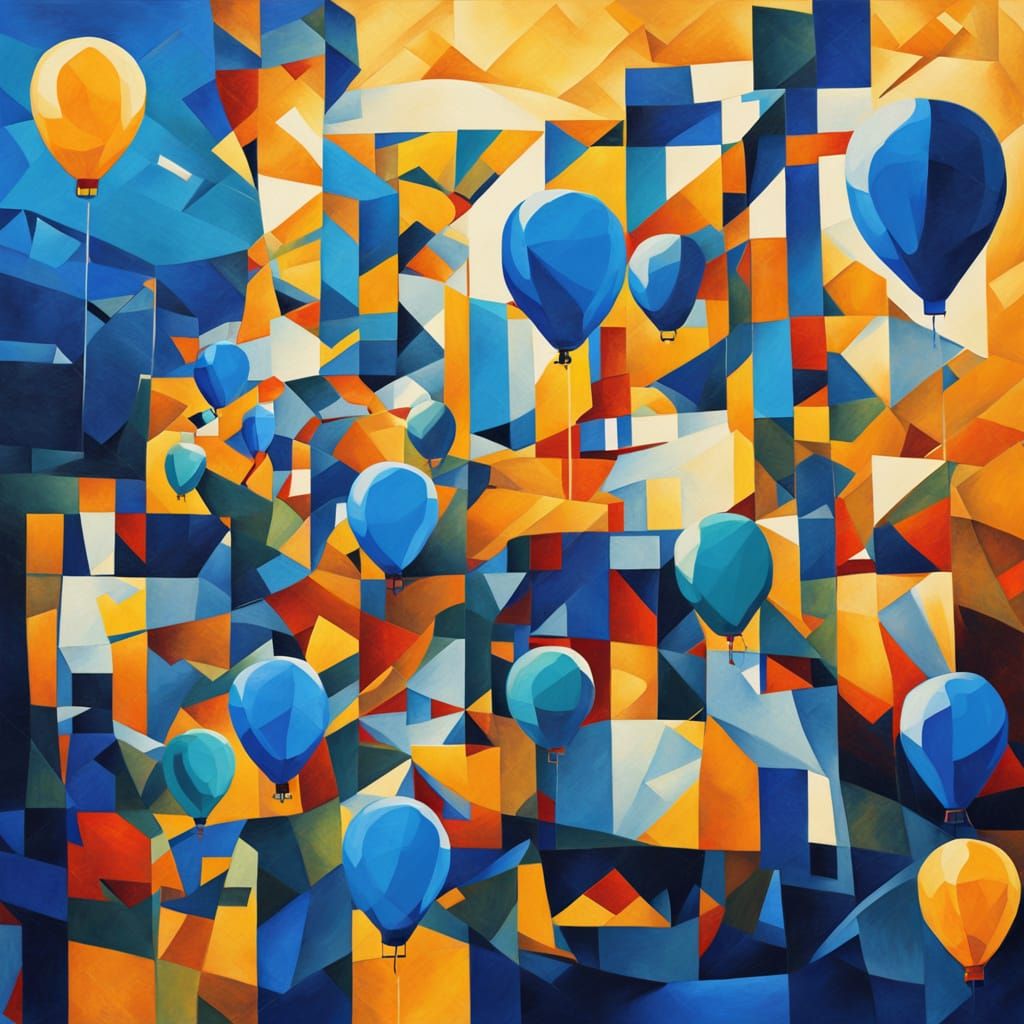 This image shows a close-up of a blue balloon floating in the air. The artwork is cubist, with geometric fauvism, angular shapes, overlapping forms and vibrant colors in warm golden lighting.