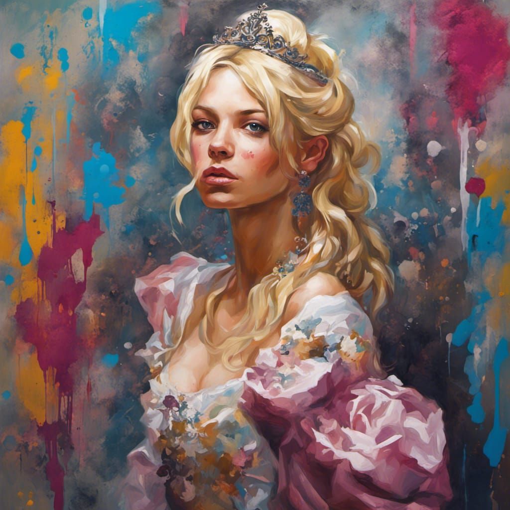 A portrait of a blonde princess in the style of an 1800s royal painting. The image is a colorful and highly-detailed digital artwork with graffiti and street art influences.