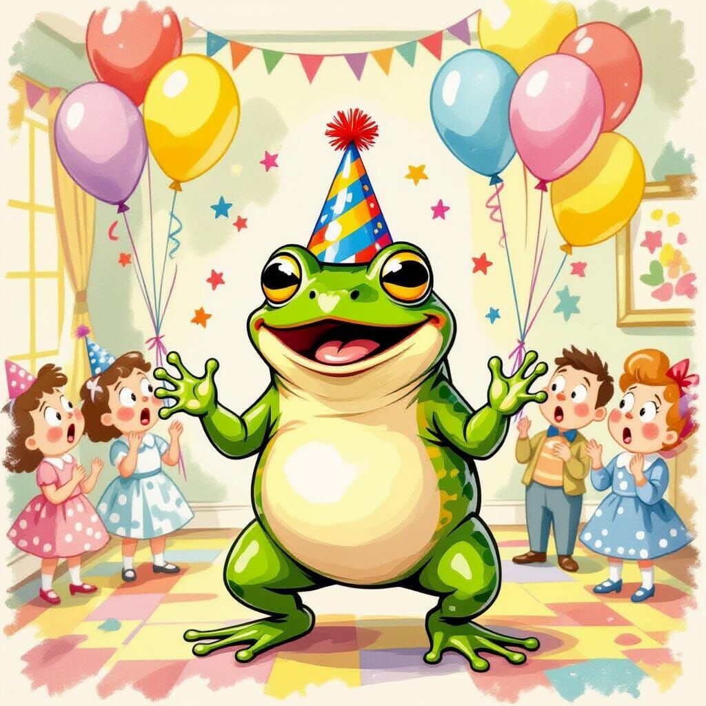 This image shows a frog dressed for a birthday party looking surprised. This heartwarming scene is rendered in a vibrant watercolor style with cartoonish elements.