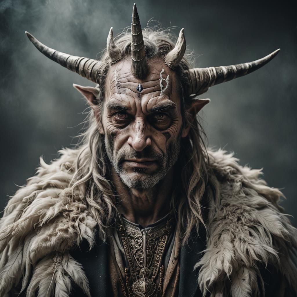 A detailed close-up portrait of a unicorn-like man with horned hands. The image is lit with ambient light, capturing a realistic and detailed aesthetic.