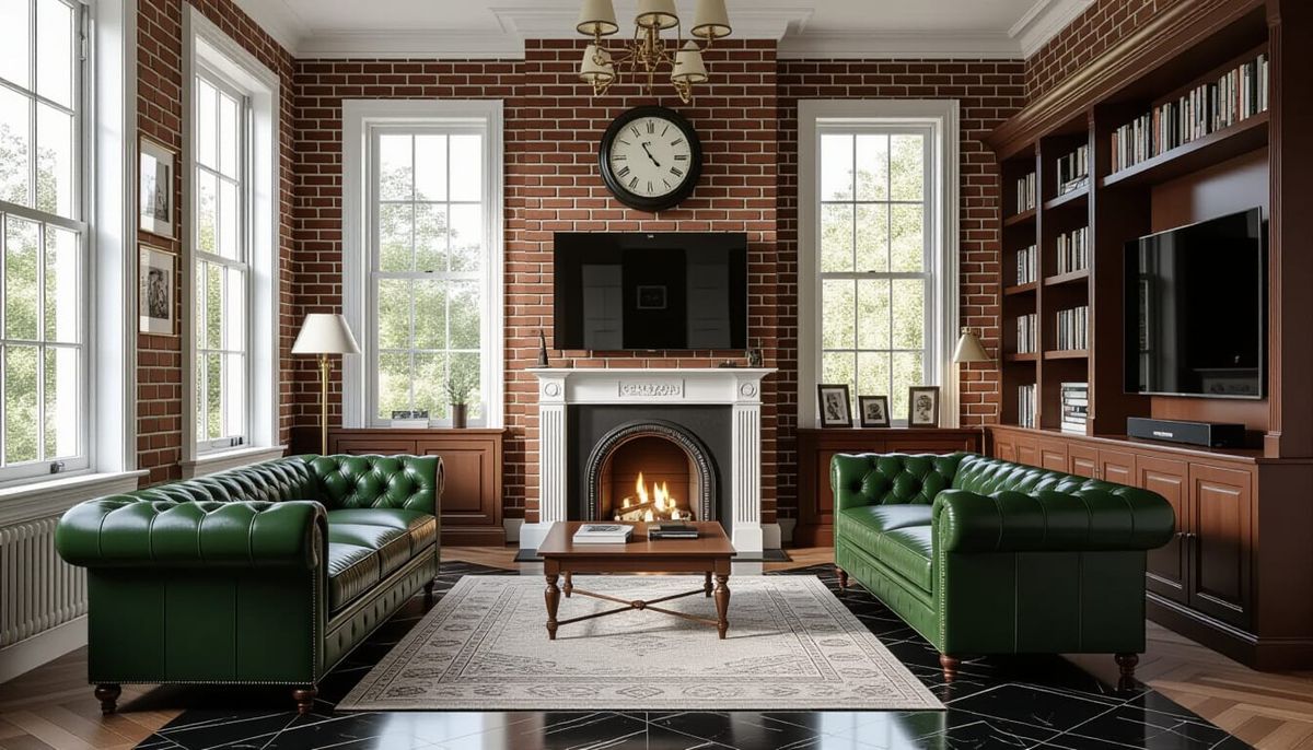 A photorealistic, wide-angle cinematic view of a sunlit Victorian living room featuring a green leather sofa, brick wallpaper, and a contrasting modern TV. Volumetric lighting enhances the 8k resolution details.