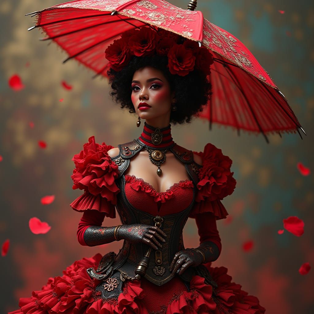 A striking image of a steam-powered siren in Afro-Mexican attire, blending flamenco flair with industrial armor and mechanical accessories, exuding fiery personality and confidence.