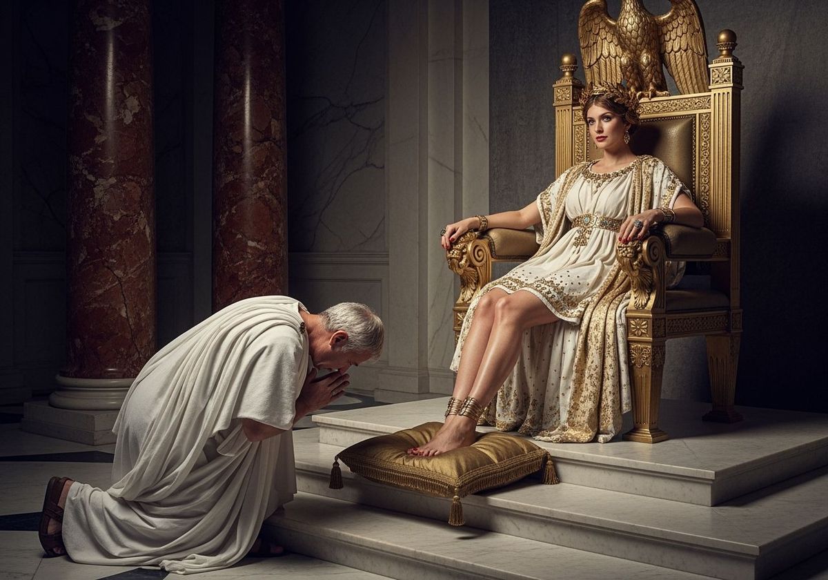 This image shows Empress Messalina on her throne, an old senator kneeling before her. The art evokes the style of baroque masters, focusing on photorealistic detail, natural lighting, and sharp focus.
