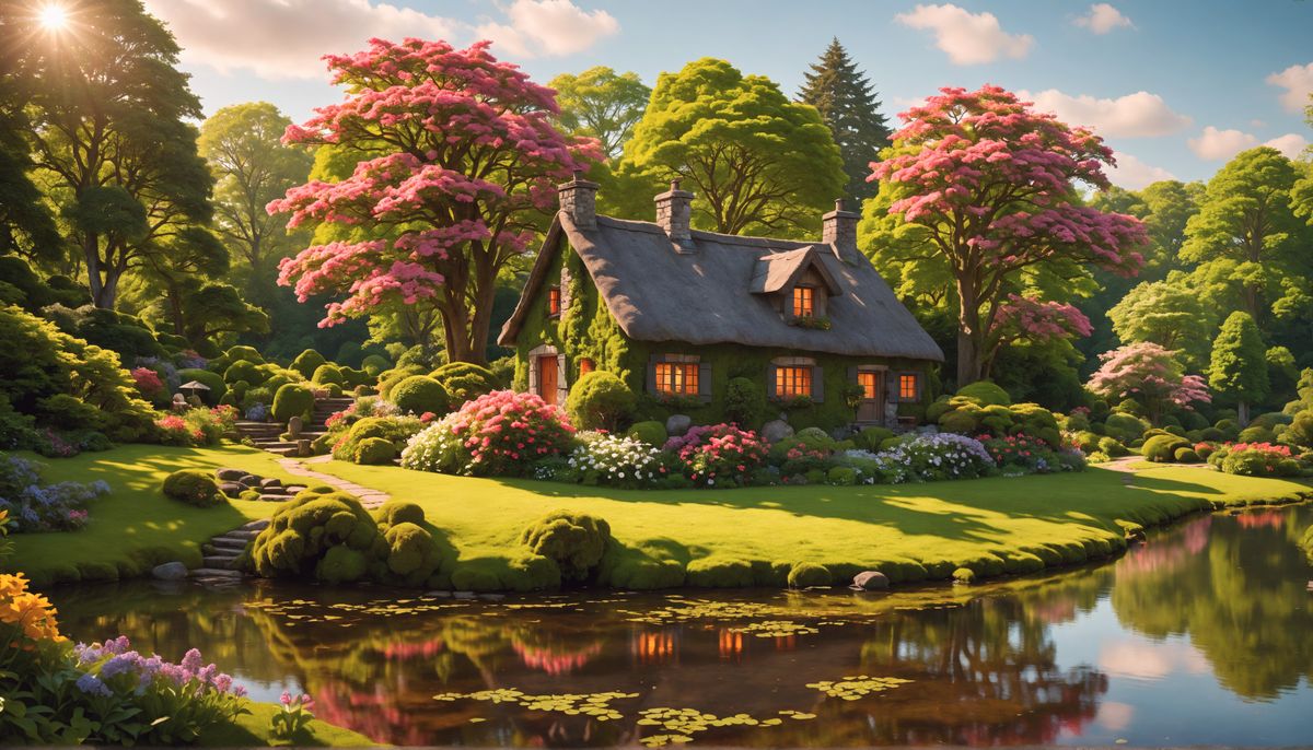 A hyperrealistic image shows a moss-covered cottage by a lake with a vibrant garden. Sunlight creates dappled shadows, captured with a shallow depth of field and bokeh, in an impressionistic style.