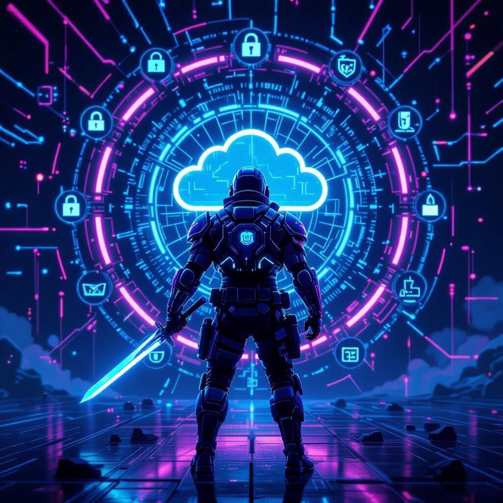 A muscular cyber threat hunter in glowing blue and purple gear stands in a digital landscape. The art style is dynamic digital art with volumetric lighting and an electric color palette.
