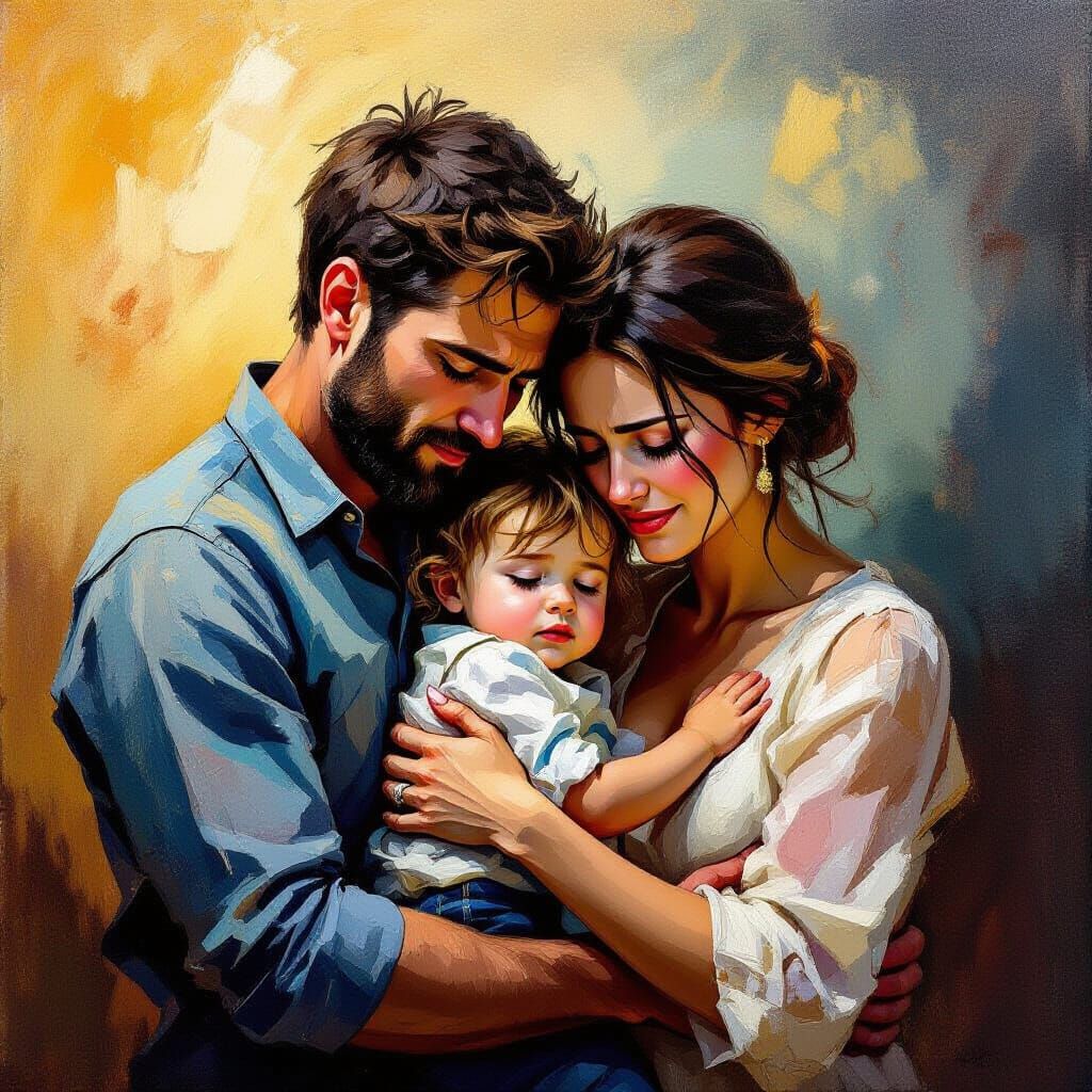 This image depicts a deeply emotional moment of a couple embracing their child, with dramatic lighting and thick brushstrokes conveying intense feelings. It's rendered in a captivating, theatrical style.