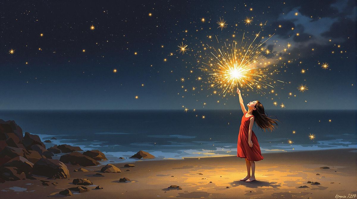 A young girl stands on a rocky beach at twilight, her sparkler lighting up the dreamy atmosphere as the stars twinkle above in a soft, impressionistic painting.