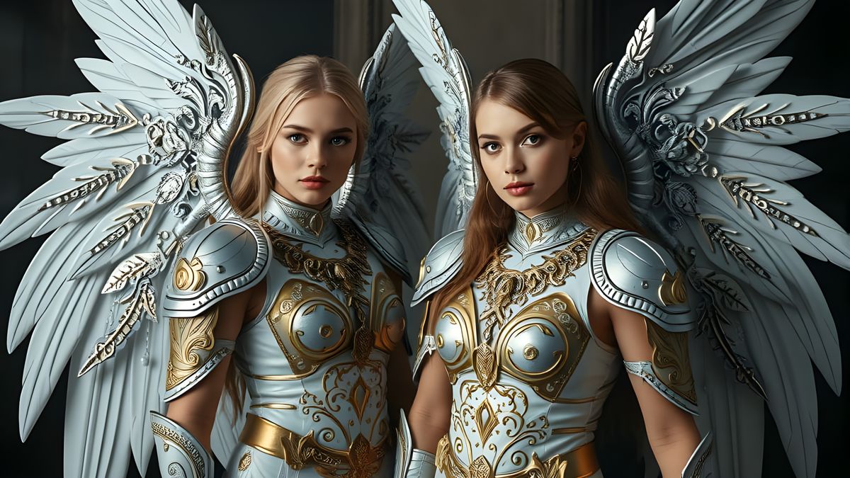 This image shows female angels in white and gold leather armor. The hyperrealistic image features intricate details, high contrast, and atmospheric mood in a cinematic style.