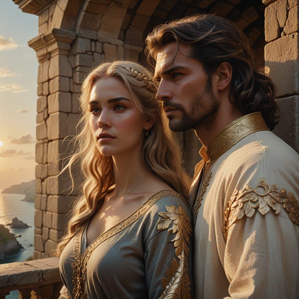 This image shows a dark-haired woman and a blonde man on a stone balcony. Soft golden light illuminates their faces in this romantic oil painting with pastel colors, soft focus, and cinematic lighting.