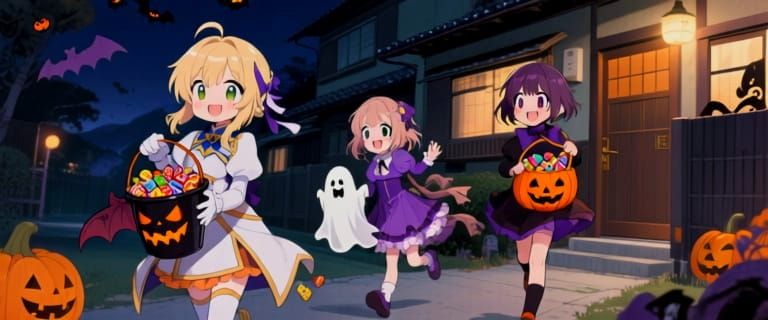 This image features adorable anime girls in Halloween costumes trick-or-treating at Japanese homes, inspired by Ukiyo-e style.