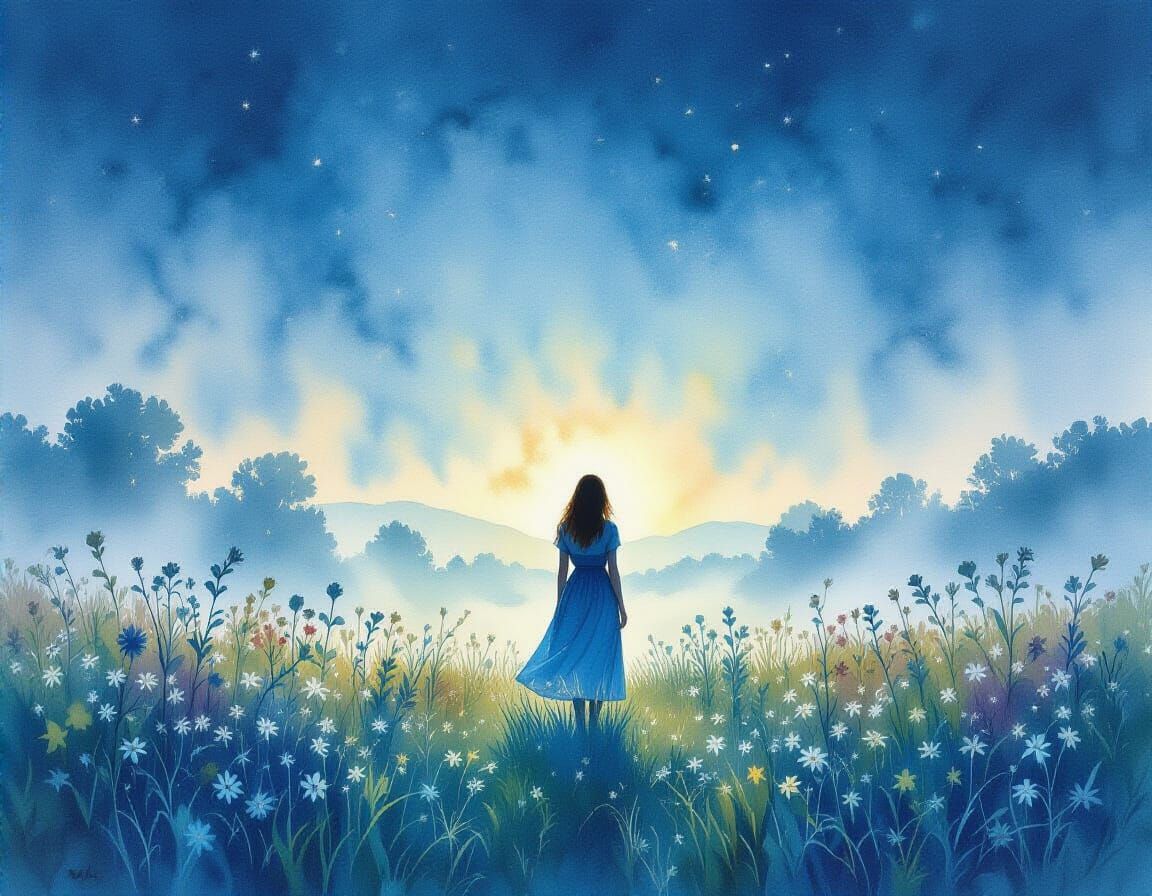 This image shows a woman gazing at an azure sky from a misty meadow filled with whimsical flora and fauna. The artwork features delicate textures and complementary colors, reminiscent of watercolor on canvas with glazed color effects.