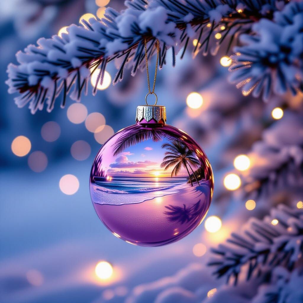 This hyper-realistic image features a pink Christmas bauble on a tinsel branch, with a distorted reflection of a Hawaiian lei. Lit by soft light during a snowy evening, it evokes a magical holiday feel.