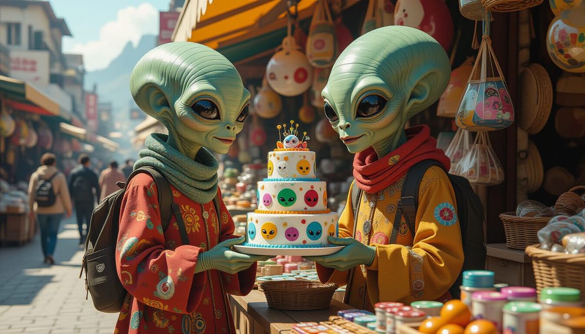 This image shows an alien with a large head buying a cake from a street vendor. The scene is rendered in a hyperrealistic, cinematic style.