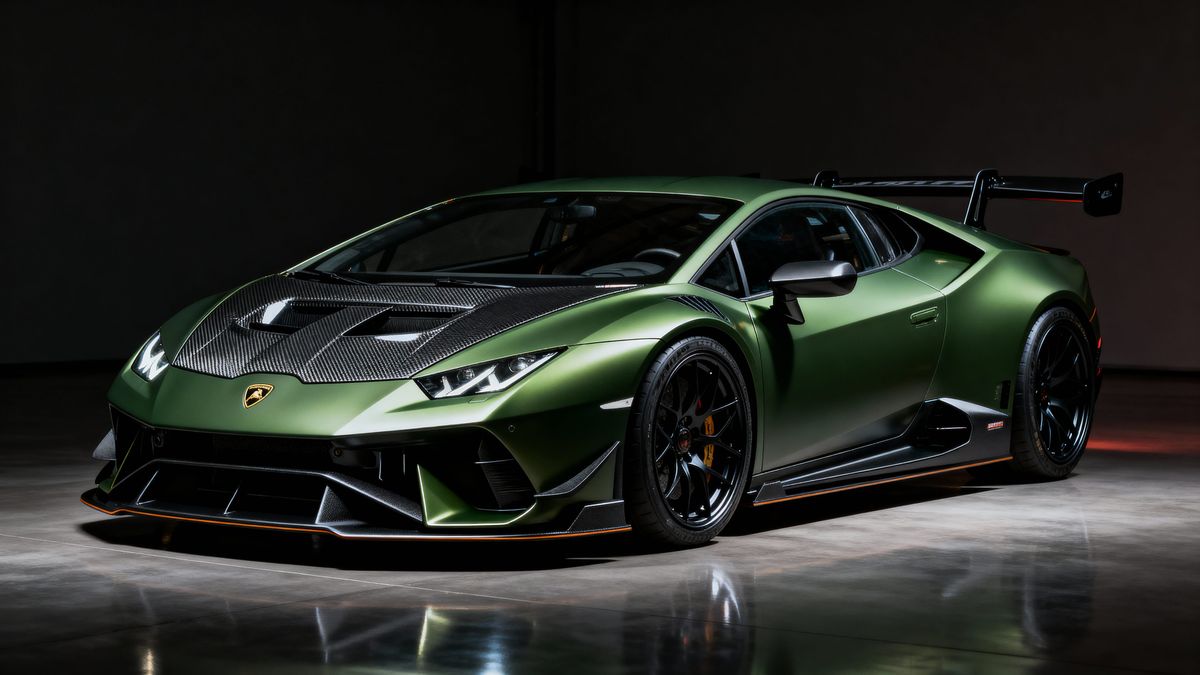 This ultra-realistic photograph showcases a modified Lamborghini in metallic forest green. It features a carbon fiber hood, wide body kit, and sleek black wheels, captured with cinematic studio lighting.