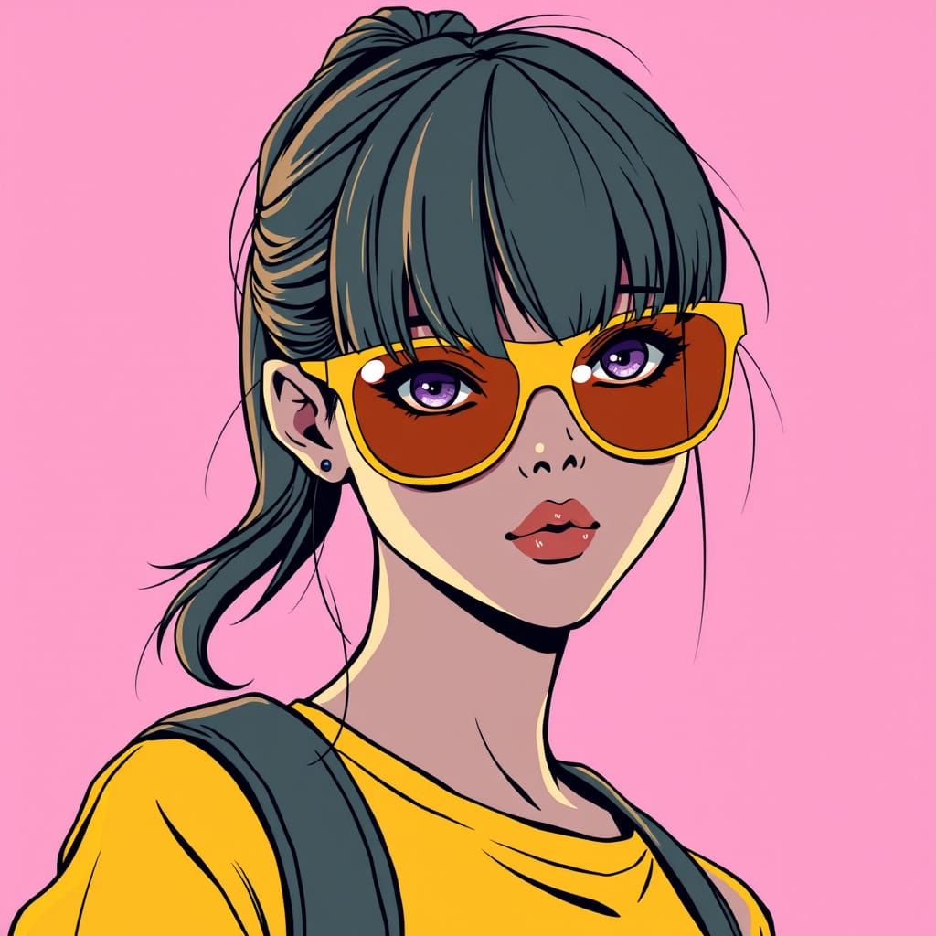 This image shows a high school girl avatar with yellow sunglasses and purple eyes. The energetic portrait is rendered in a film noir style with bold lines and minimalist pop art colors, with anime-inspired expressive features.