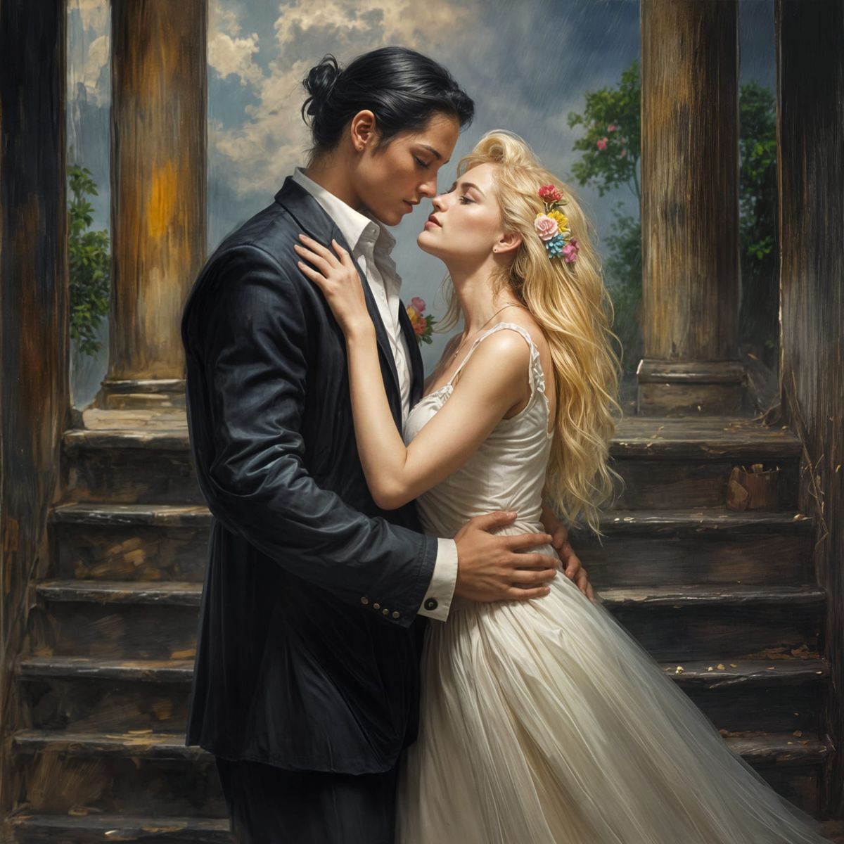 This image shows two women finding comfort and connection in each other's arms during a storm. They share a gentle kiss while hiding in a darkened stairway.