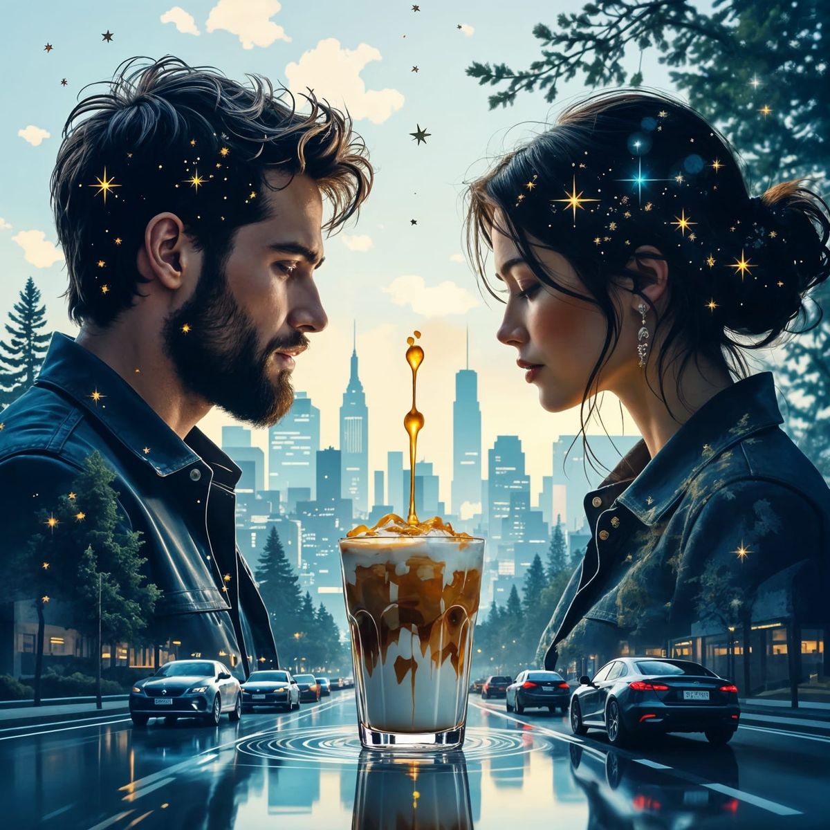 A striking picture of an ice coffee drink cascading into an intricate world of trees, cities, stars, and automobiles with a motorbike silhouette. Double exposure effect in a maximalist style.