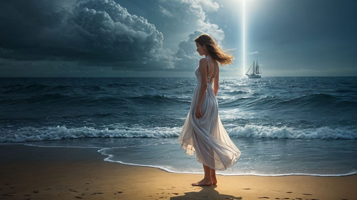 A woman stands barefoot on darkening sand as a storm gathers, bathed in a single beam of light. A sailboat drifts on the horizon. 3D anime art style.