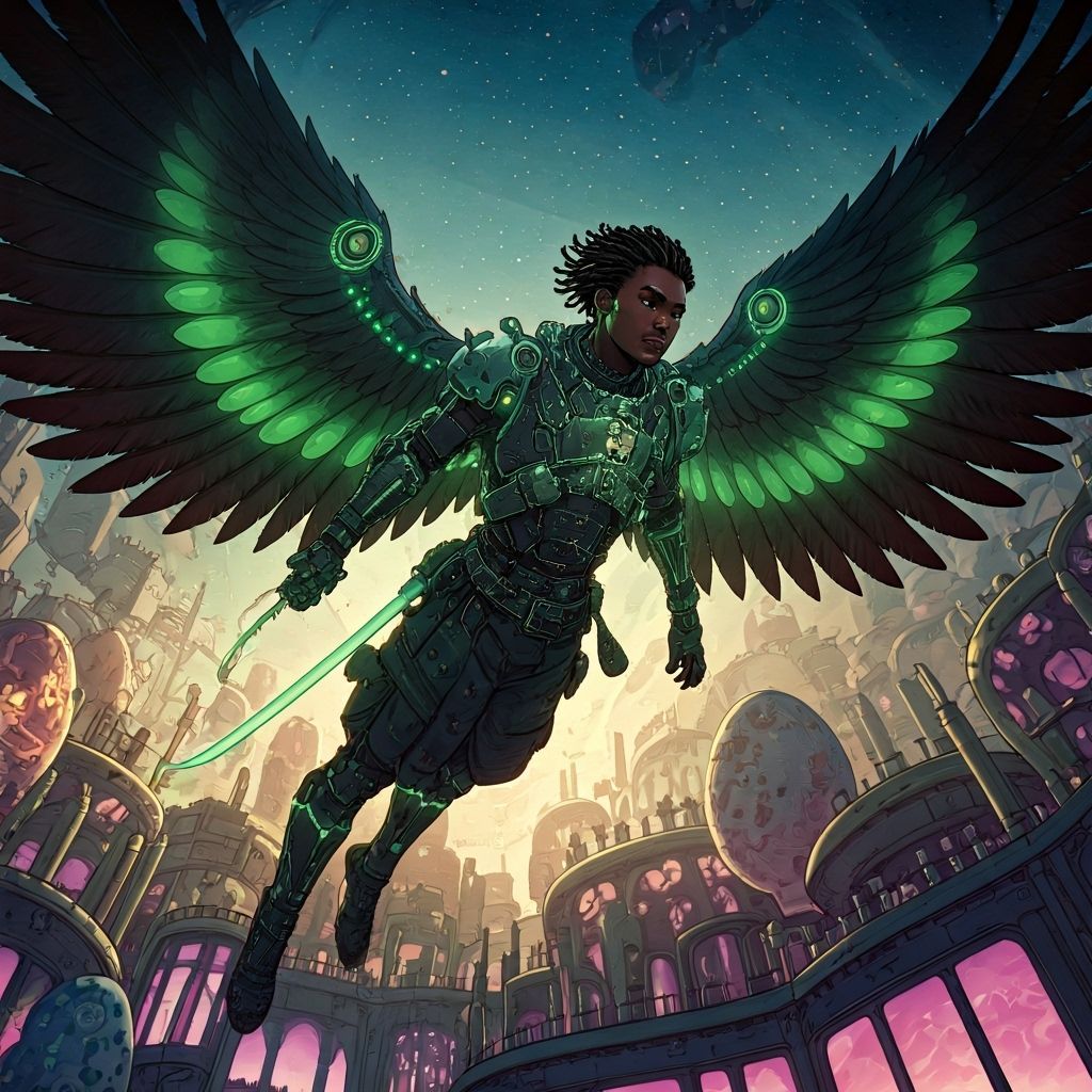 A striking picture of a Black man with braids and feathered wings soaring over a glowing cityscape. He wears biomechanical armor and wields an energized katana in a manga-inspired style.