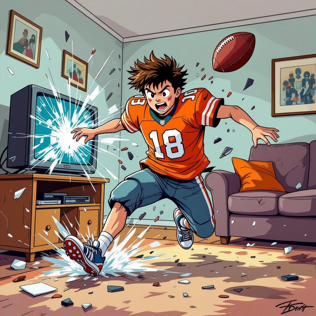 A vibrant scene of someone playing football indoors, accidentally breaking a television. Features bold lines and dramatic lighting for a dynamic visual.
