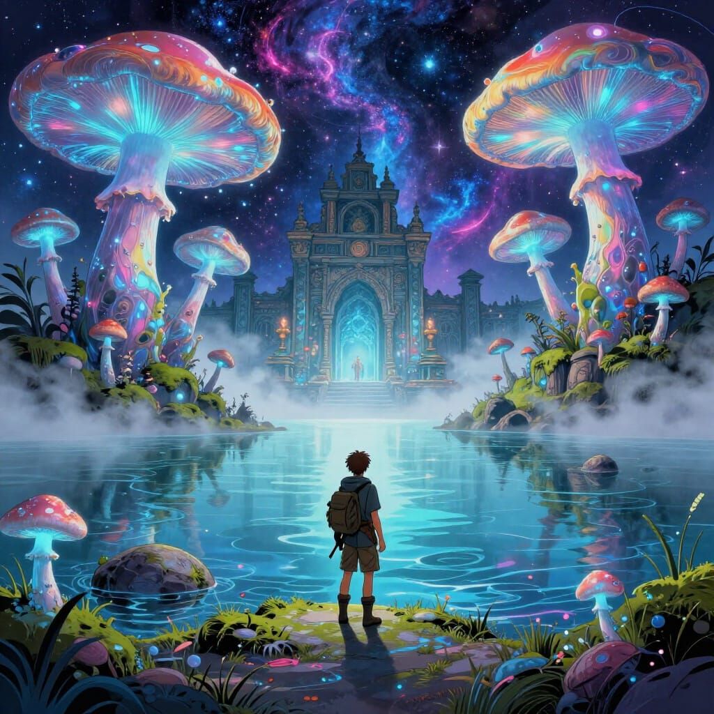 This image shows an ethereal adventurer on misty shores of a dreamlike lake. Submerged ruins and giant, glowing mushrooms cast an otherworldly light. Rendered in a vibrant splash art style.