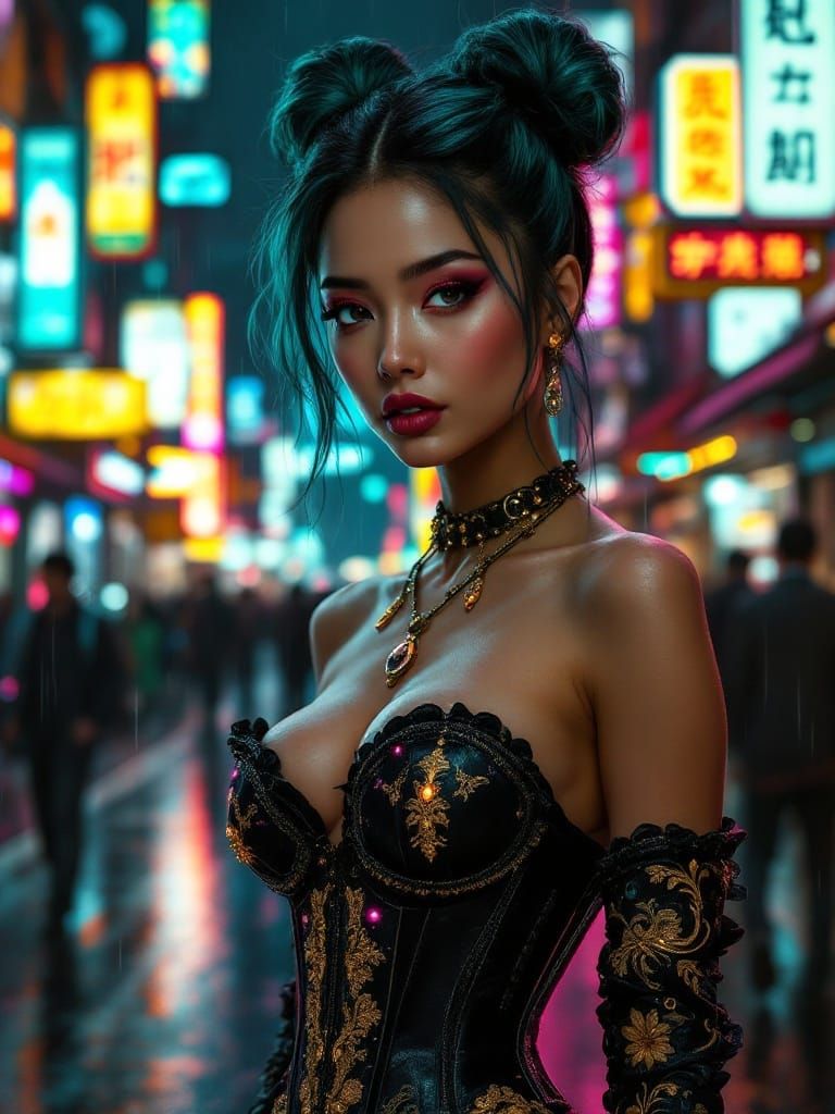 A striking image of a confident young woman in a futuristic city, set against a backdrop of neon lights and kanji signage, with a fusion of abstract and realistic elements rendered in rich earth tones and bright accents.