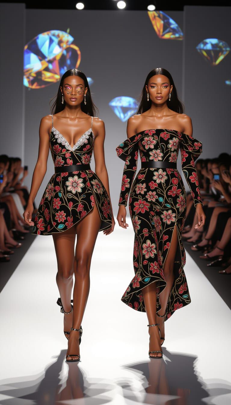 A photo-realistic image depicts two women in sparkly white silk summer dresses, adorned with glowing turquoise calligraphy. They stand within a giant diamond ring, creating a surreal and elegant scene.