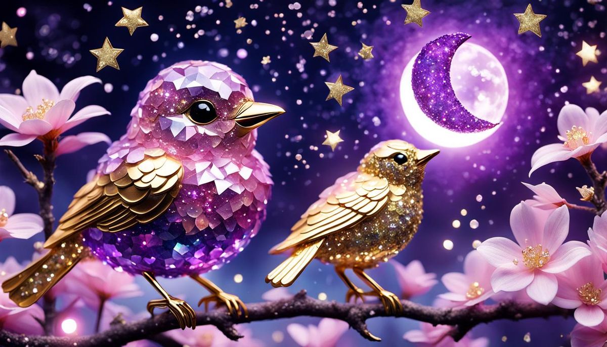 This image shows a pink crystal bird adorned with glitter and sequins, set in a luminous purple garden. Stars bloom like flowers across a cosmic landscape, rendered in a maximalist glittering style.