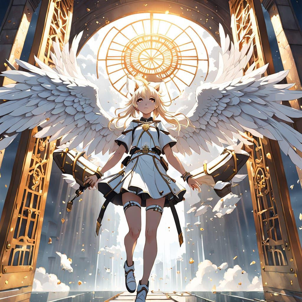 This stunning 3D anime artwork depicts a white angel wolf floating towards heaven's gates, gazing down at her friends on earth with tears in her eyes. Created in exquisite detail, this piece showcases a beautiful blend of anime and digital art styles.
