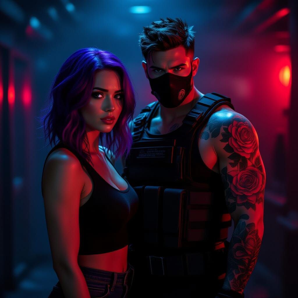 This image depicts a tense scene in a dimly lit room with red and blue lighting. A purple-haired woman appears distressed while a masked man with tattooed hands stands guard.