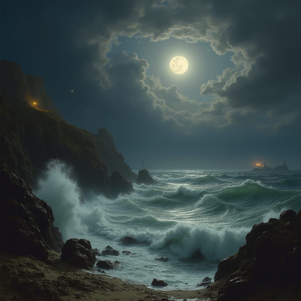 This image shows a stormy English coastline at night, circa 1740s. A full moon casts an eerie glow on the waves crashing against the rugged shoreline during the tempest.