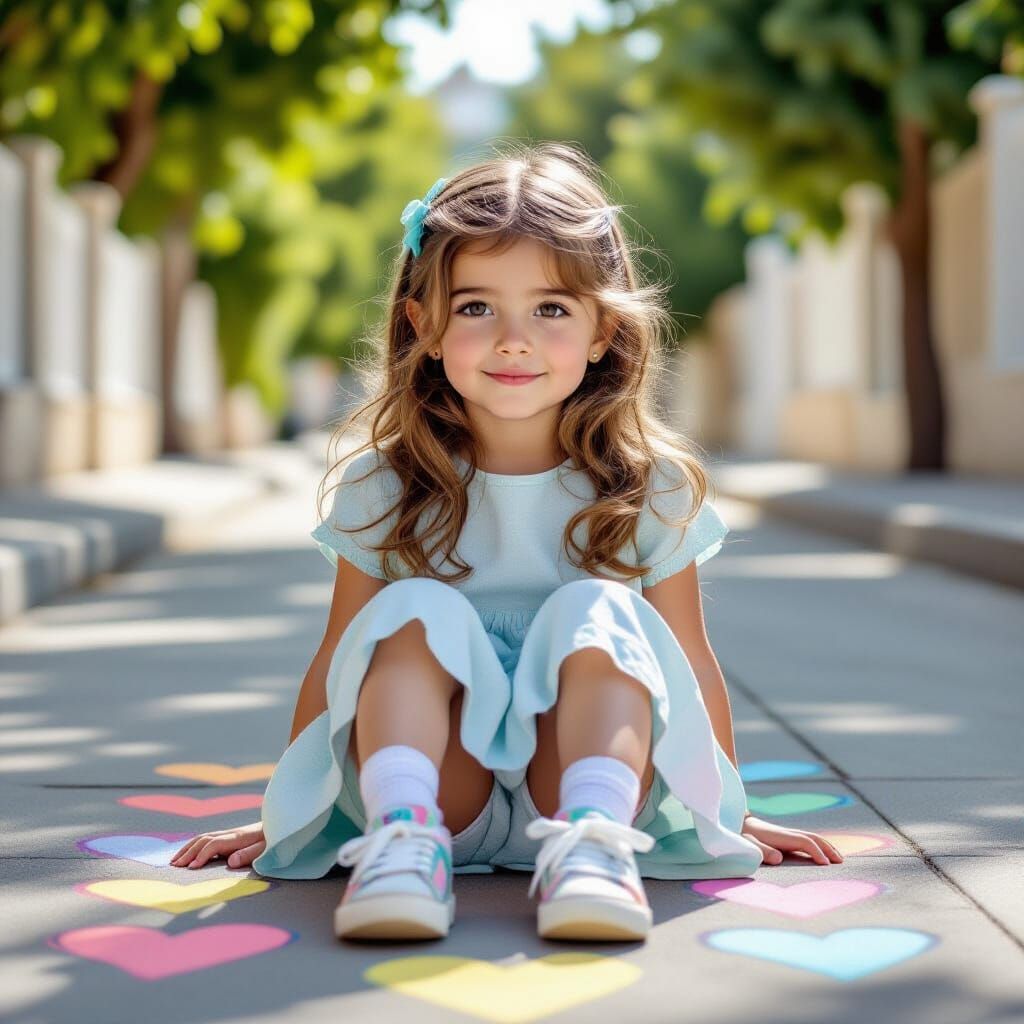 This image portrays a 9-year-old Israeli girl with fair skin and light brown hair sitting on a sidewalk in a quiet neighborhood, lost in thought with a gentle smile.
