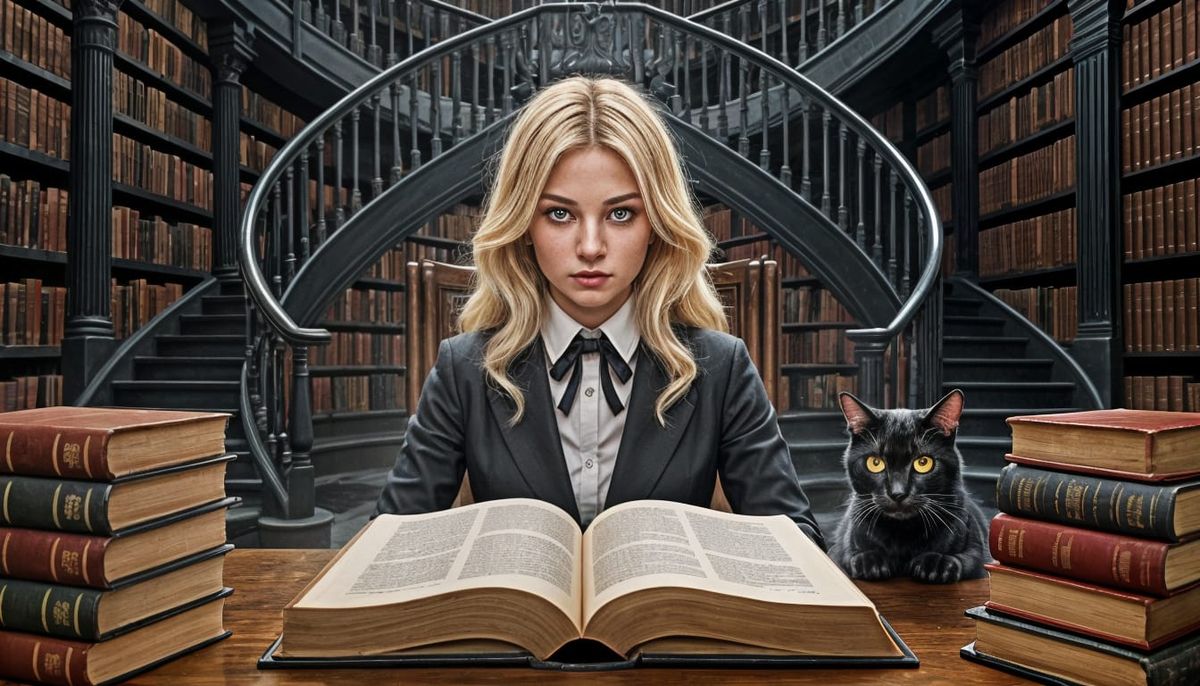 This image shows an evil looking blonde woman with gold eyes staring from behind a table of books in a dark academic library. A black cat with glowing red eyes is on the table.