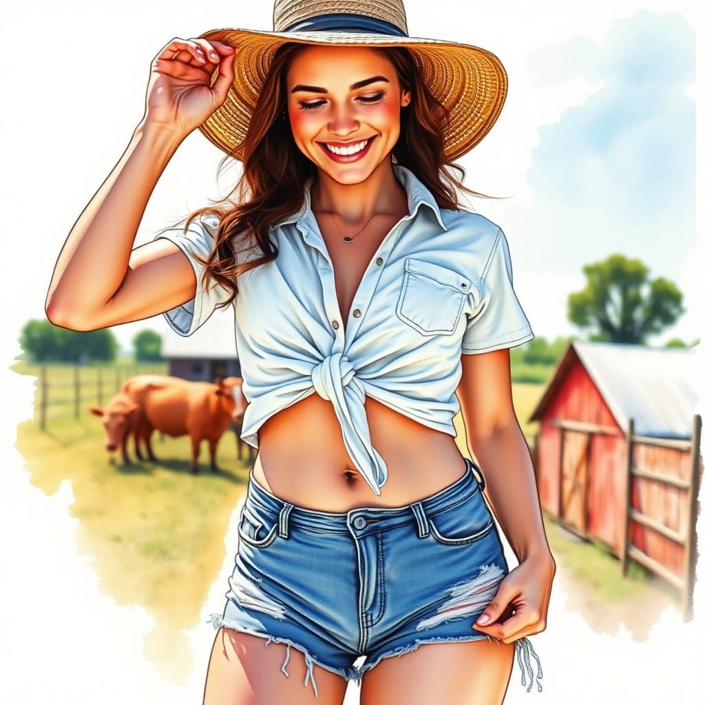 This image shows an athletic woman on a farm, wiping sweat from her face with a grin. The artwork is a vibrant watercolor and pen painting with strong light and shadow contrasts.