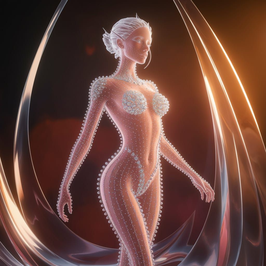 This image depicts a woman's transparent body intricately filled with shimmering diamonds, set against a rich, deep backdrop of warm, ethereal light and delicate shadows, rendered in meticulous detail for a captivating fantasy concept art piece.