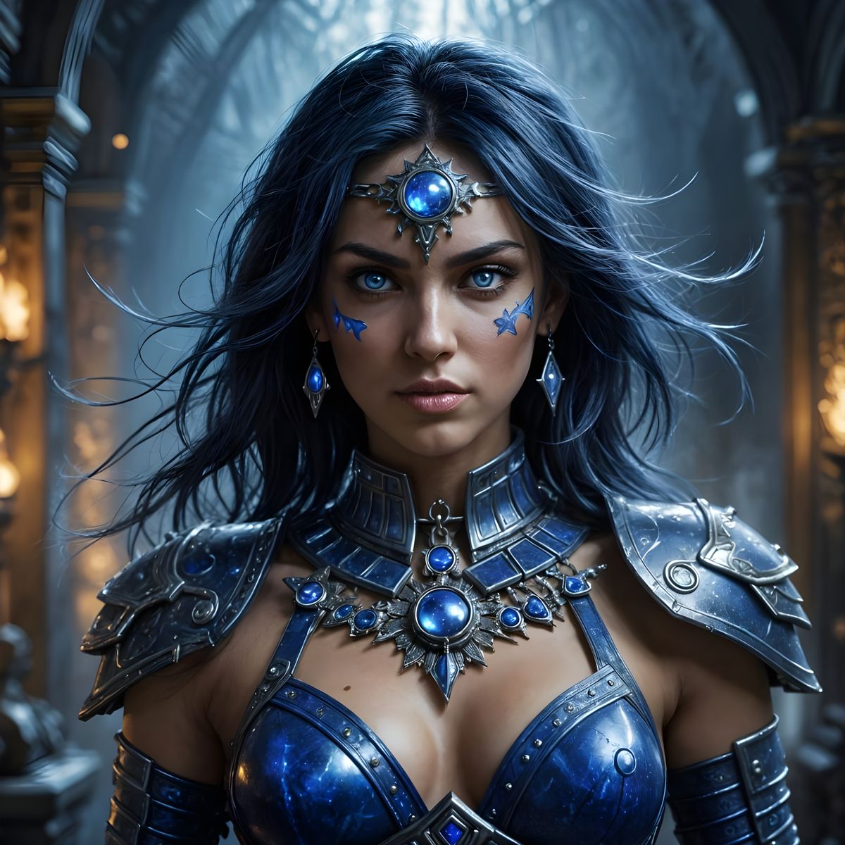This image shows a powerful female warrior from the Warhammer 40k universe, surrounded by sacred energy and adorned with mystical symbols. She wears a stunning Lapis Lazuli bikini top and has indigo glowing eyes and hair, evoking a sense of otherworldly intuition and sight.