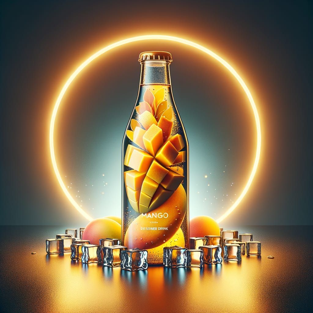 This image shows a stylishly bottled drink called 'Mango Tango' in vibrant shades of orange, yellow, and gold. Ice cubes surround the bottle, which is illuminated by a modern LED ring.