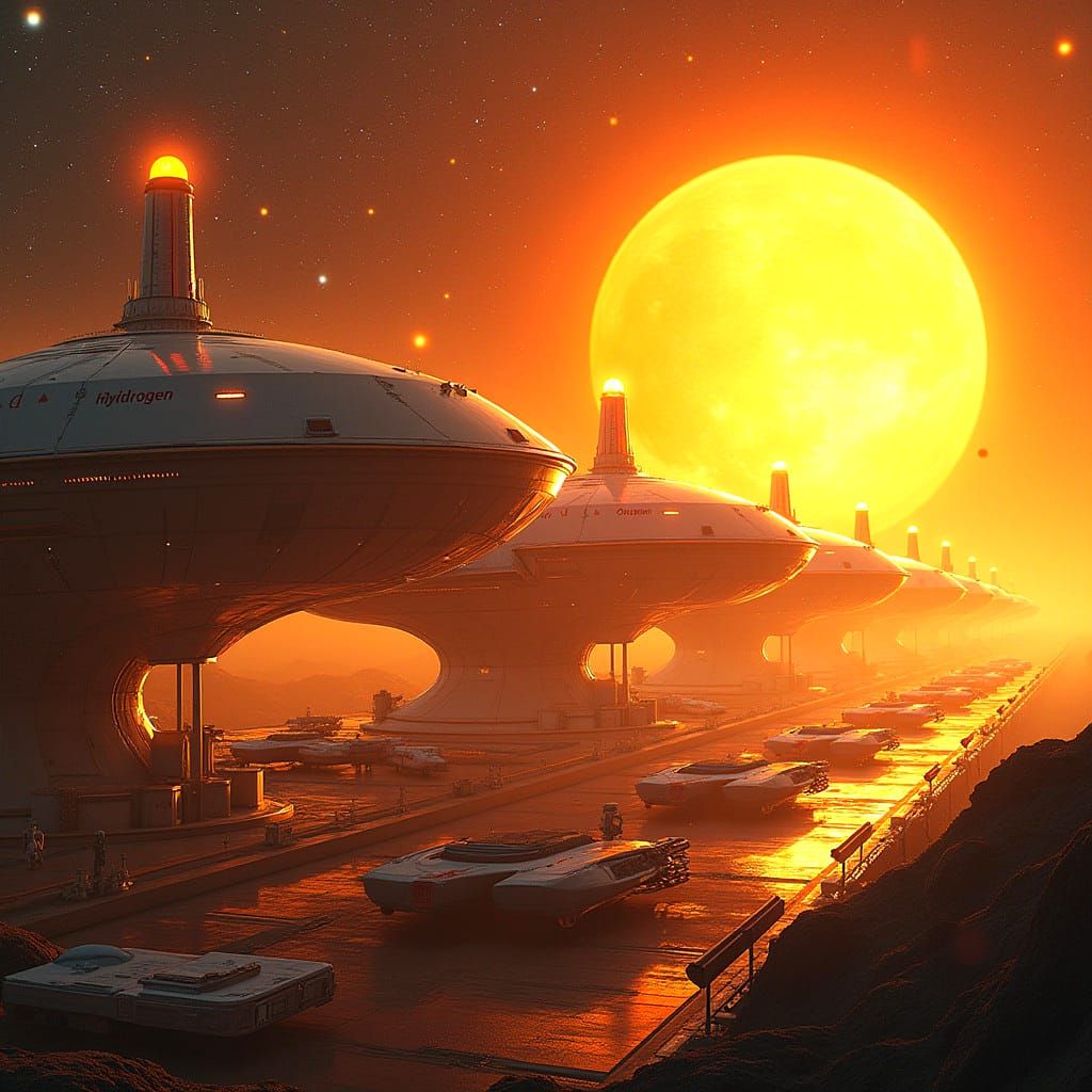 This image shows a futuristic gas station in space with spaceships refueling. The bright, colorful scene depicts a happy morning in the universe with stars visible in the background, rendered as professional photography.