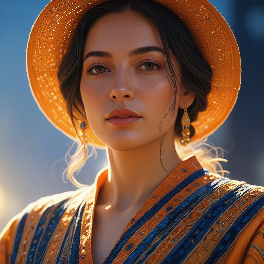This image shows a medium shot of a woman in elaborate clothing. The hyper-realistic oil painting style features delicate brushstrokes, an expressive color palette, and warm golden light.