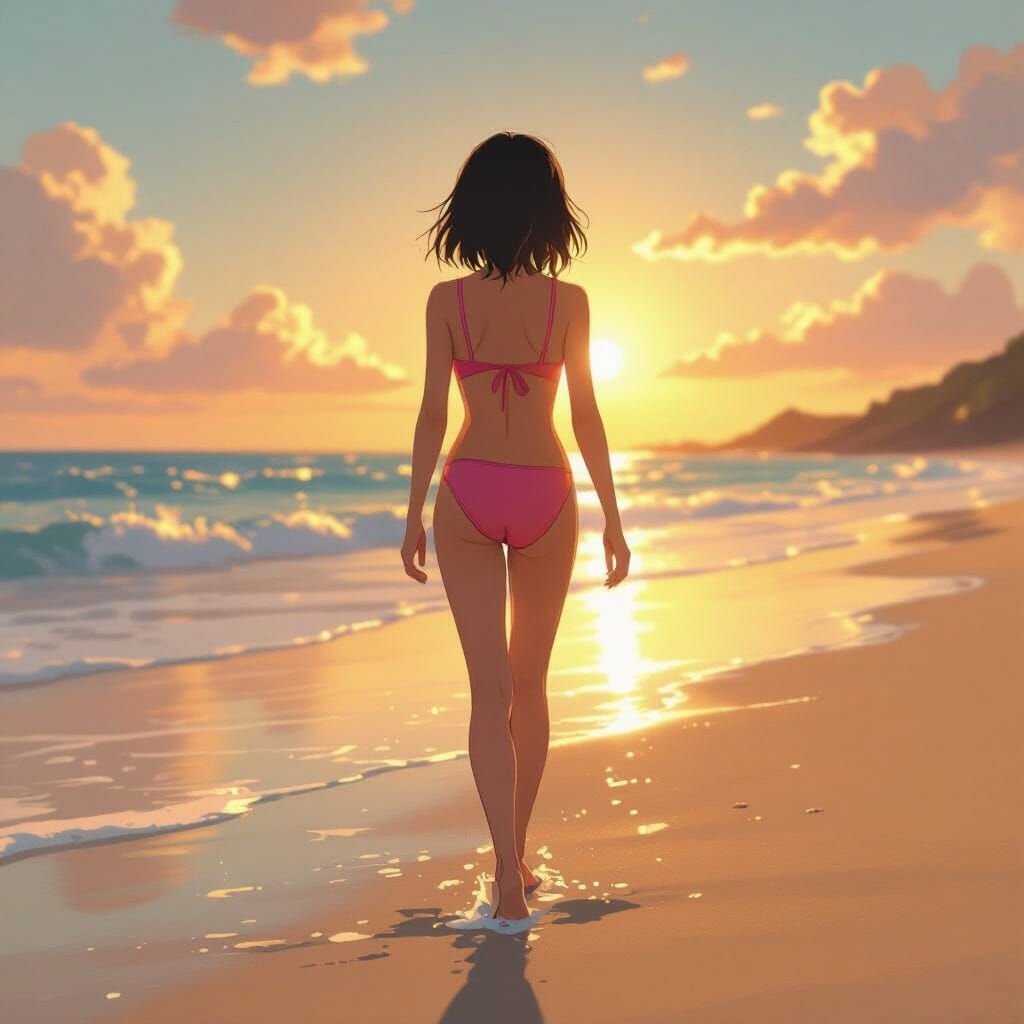 This image shows a girl in a colorful swimsuit walking away on a sunny beach during golden hour. Rendered in a painterly anime style with warm lighting.