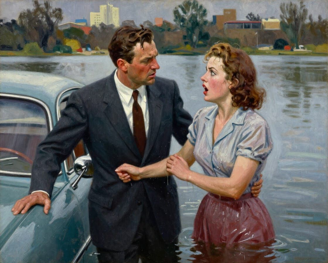 This image shows a man in a suit looking annoyed at a soaked woman holding a car half in a lake. Rendered in an impasto oil painting style with dramatic lighting and vivid colors.