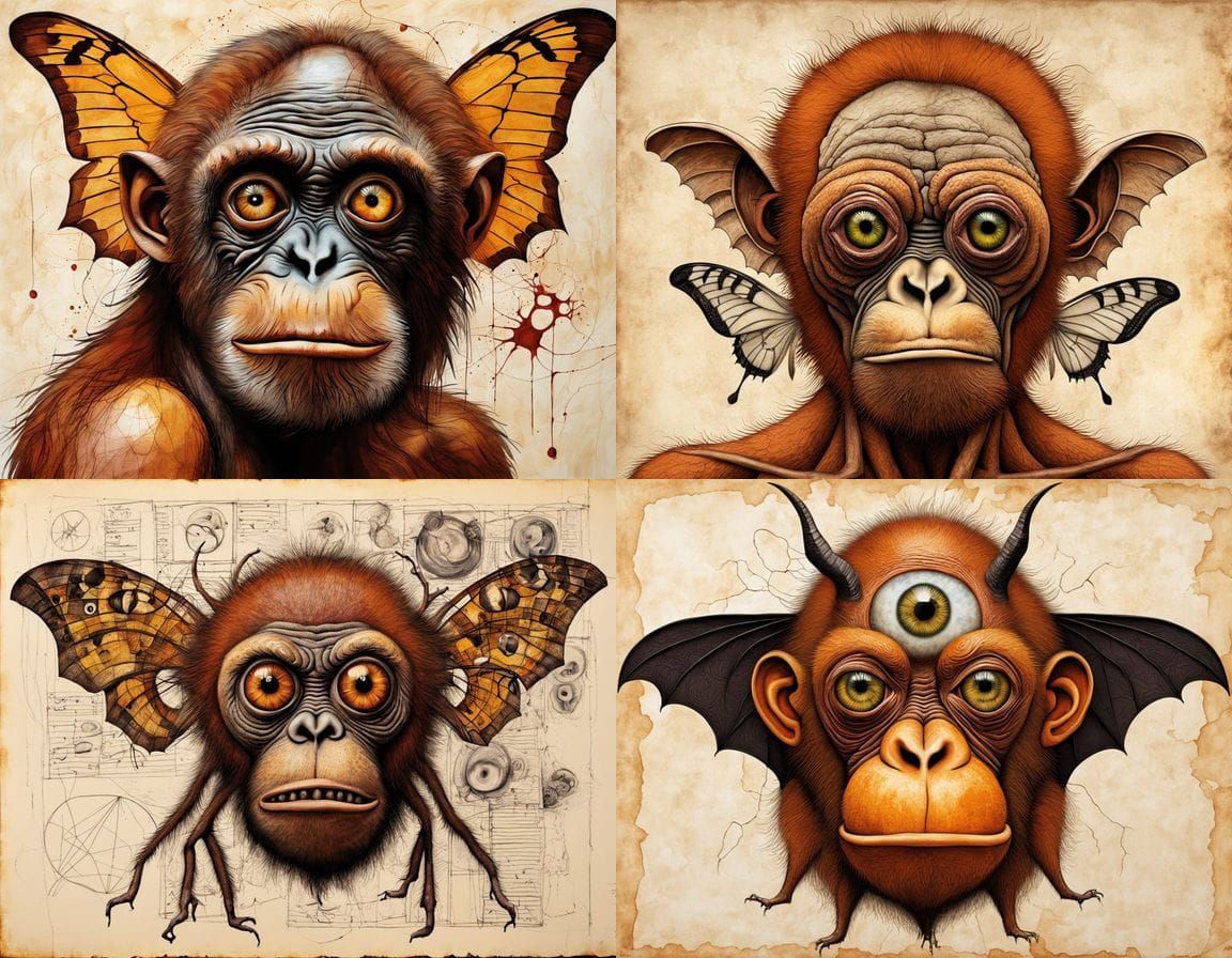 A bizarre horror hybrid of an orangutan, bat, and moth, featuring unsettling anatomical elements. This 3D mixed media artwork evokes the style of layered paper collage with loose, sketchy lines.