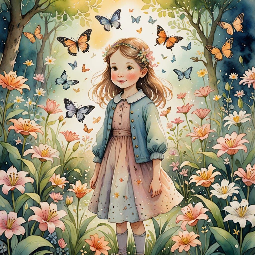 This image shows a young girl named Lily in a vibrant garden scene. The artwork is rendered in a whimsical watercolor style, reminiscent of classic children's book art. Butterflies and flowers add to the magical atmosphere.