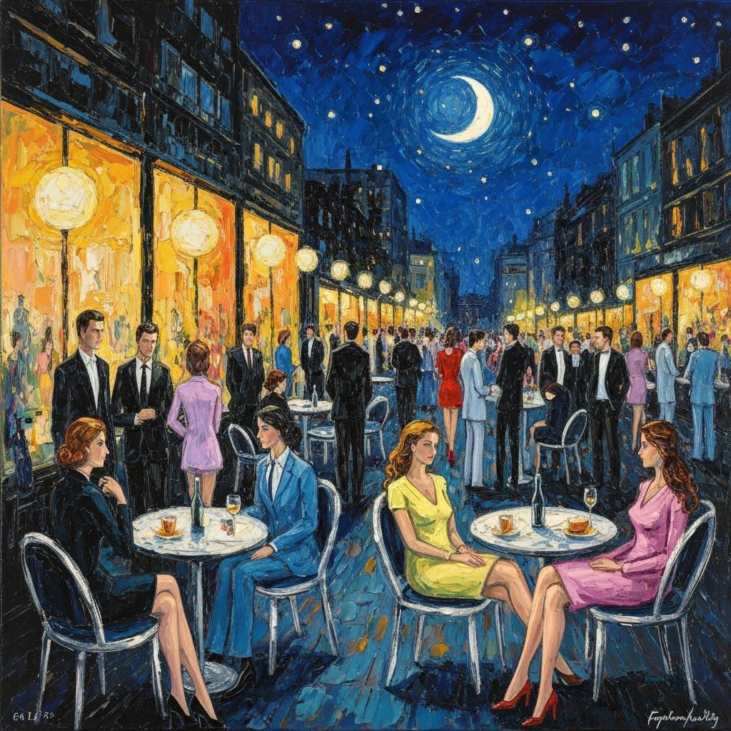A digitally painted cafe scene at night, featuring modern patrons and furniture under a starry sky. The image is rendered with thick layers of colorful textured oil paint, in a neo-impressionistic style.