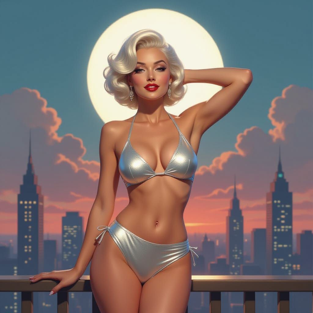 A vintage pin-up woman with a cloud-like hairstyle poses confidently against a retro-futuristic cityscape at dusk. The image blends art nouveau curves with ultra-realistic rendering in a cinematic composition.