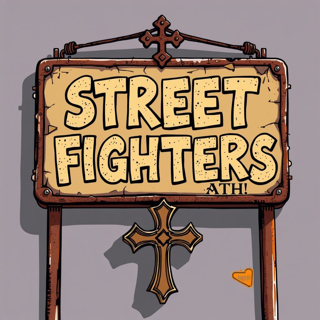 This image shows a vintage sign displaying "150 STREET FIGHTERS ATH" in graffiti style. The sign, mounted on a rusty frame with an orthodox cross, is rendered in a vibrant, old-school street art style.